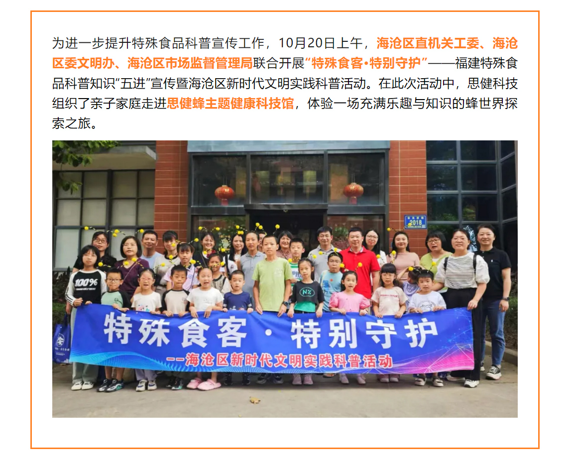 特殊食品知多少?這場活動(dòng)甜蜜又有料….福建特殊食品科普知識(shí)“五進(jìn)”宣傳暨海滄區(qū)新時(shí)代文明實(shí)踐科普活動(dòng)走進(jìn)思健蜂主題科技館